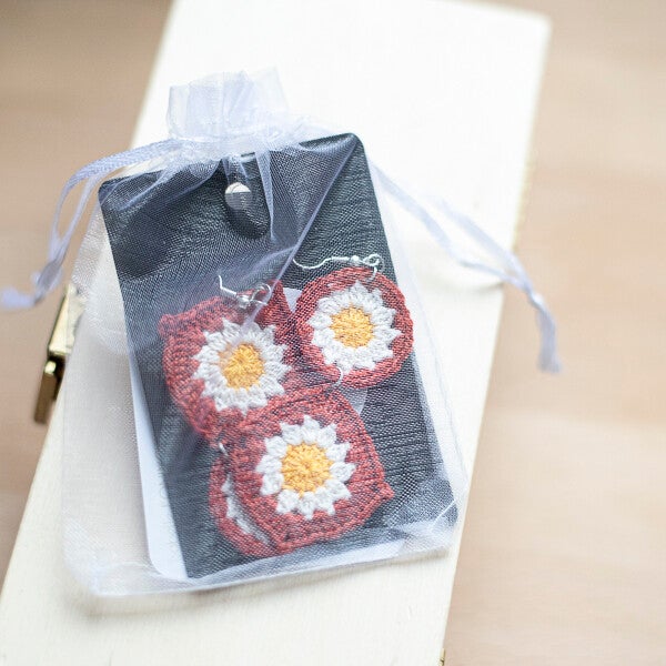 Ces boucles d'oreilles sont fabriquées à la main avec un crochet de 1 mm et du fil à coudre Gütermann.